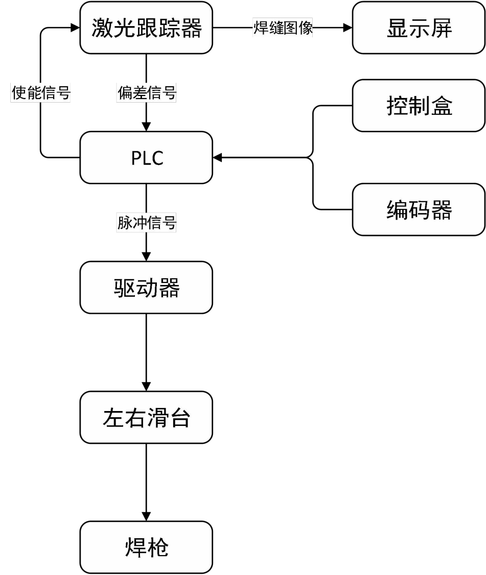 如下图所示,设备包含跟踪器,人机界面,微嵌屏,PLC 控制柜,驱动器, 跟踪滑台,摆动滑台,控制盒。激光焊缝跟踪器通过激光发射与接收,经过内部算法处理得到焊缝图像与偏差信号。焊缝图像通过网口传送给显示屏,显示屏显示图像。伺服编码器计算旋转电机的旋转脉冲数,转换成行走距离,发给 PLC 用于实现多层多道。跟踪器检测出的正确焊缝位置数据,通过以太网通讯发给 PLC,经过 PLC 运算处理转化成脉冲信号发送给驱动器,从而调正焊枪位置。