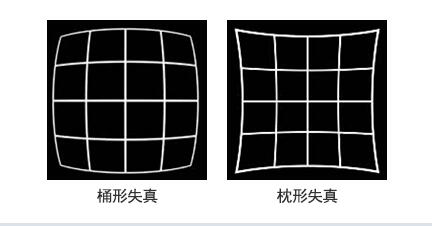 表示通过镜头成像的图像发生歪曲的状态。事实上不存在形状完美的镜头。因此,虽然从理论上来说,直射光通过镜头后会沿着直线传播,而实际上光通过镜头后会向外侧或者内侧歪曲。前者称为「桶形失真」,后者称为「枕形失真」。一个镜失真的参数以百分比表示。