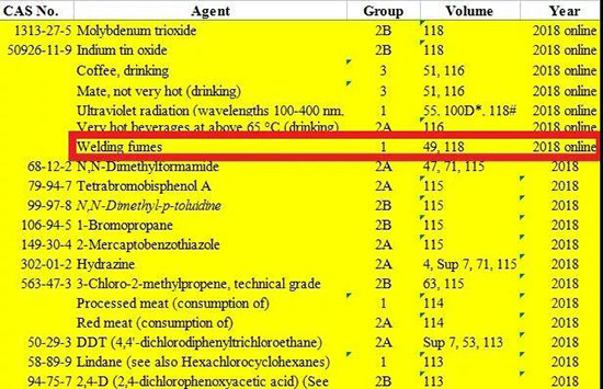 在当前的评估中,焊接烟雾和UV辐射被归类为“对人类致癌”(第1组)。