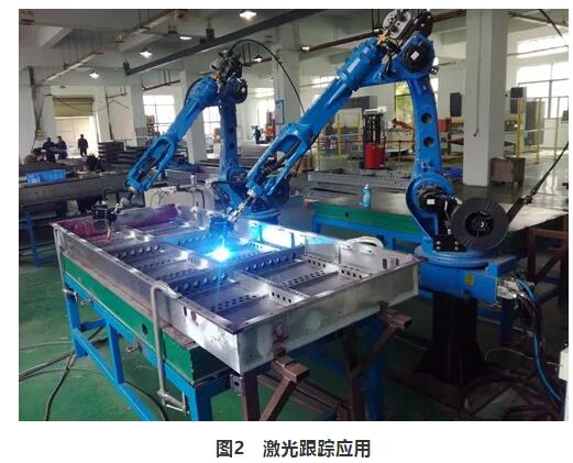 在实际自动焊接过程中,激光焊缝跟踪器的作用是对焊缝做精确的定位。一个完整的焊缝检测跟踪系统通常由激光结构光传感器、控制器及执行机构组成,它们构成了一个完整的闭环控制系统,实现了检测、计算和执行的功能。在实际使用中执行机构有可能是由伺服电动机、直线导轨滑台组成的焊接专机,也可能是焊接机器人。控制器一般为工控机或FPGA、DSP等嵌入式处理器。除此以外,一般还包括焊接电源、工装夹具及上下料机构等。机器人自动焊接工作站就是一种典型的应用,首先通过视觉传感器寻位确定工件及焊缝的位置,修正真实焊缝的焊接起始位置,在焊接过程中启动实时跟踪,通过实时的控制机器人不断修正机器人的焊接轨迹,达到准确的自动焊接(见图2)。目前常用的跟踪控制方式有无标定的模糊跟踪、标定实时跟踪、寻位及跟踪+寻位方式。无标定的模糊跟踪不需要精确标定实时检测焊枪与焊缝的偏差,并实时地做趋势微调控制。标定实时跟踪检测的是焊缝的实际绝对位置,同时控制焊枪运动到焊缝的实际绝对位置。寻位方式指焊接时不实时跟踪,在焊接前通过两点或多点寻位确定当前焊缝或工件的位置,提前修改执行机构的运动轨迹,从而实现精确的焊接。跟踪+寻位方式则是标定实时跟踪与寻位方式的结合。