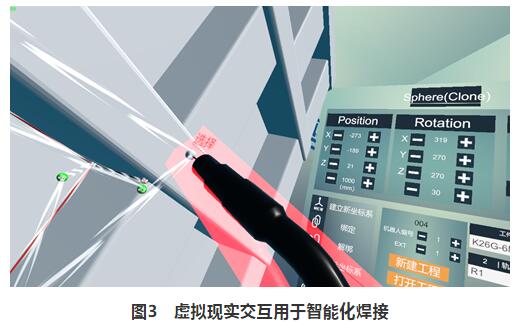 (3)虚拟现实仿真与人机交互技术。在目前的智能化焊接中,技术人员通过Unity3D在虚拟仿真与人机交互技术实现了虚拟现实交互的焊接(见图3)。人机交互界面负责机器人运动信息反馈和机器人的控制,人再通过人机交互界面对焊接机器人实施远端操作,从而达到人机交互,在一定程度上可以替代示教编程及离线编程。在复杂、恶劣的环境中将远端焊接机器人与虚拟现实结合起来并实施人机交互,既能保证焊接工人的安全又能高效地完成焊接作业。