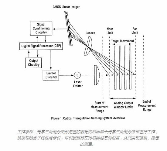 目标与传感器的距离决定了光线穿过接收器透镜的角度;然后,该角度确定接收到的光将照射到线性成像器的位置。如果目标距离较远(在最大指定范围内),则光将朝成像器最靠近激光发射器的一端落下。或者,如果目标位于其最接近的位置(在最小指定范围内),则光将降落在成像仪的相对端,距激光发射器最远。线性成像仪上的光线位置在出厂时已针对所有有效目标距离进行了校准。接收到的光通过模拟和数字电子设备进行处理,并由数字信号处理器(DSP)进行分析。